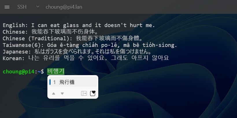 Terminalski seamlessly supports all the character code pages and input methods installed on your Windows. For character input methods that require compositions such as Chinese/Japanese/Korean, Terminalski delays sending the characters until you enter a non-composition-required character (ex. alphabets, space, numbers and etc.).