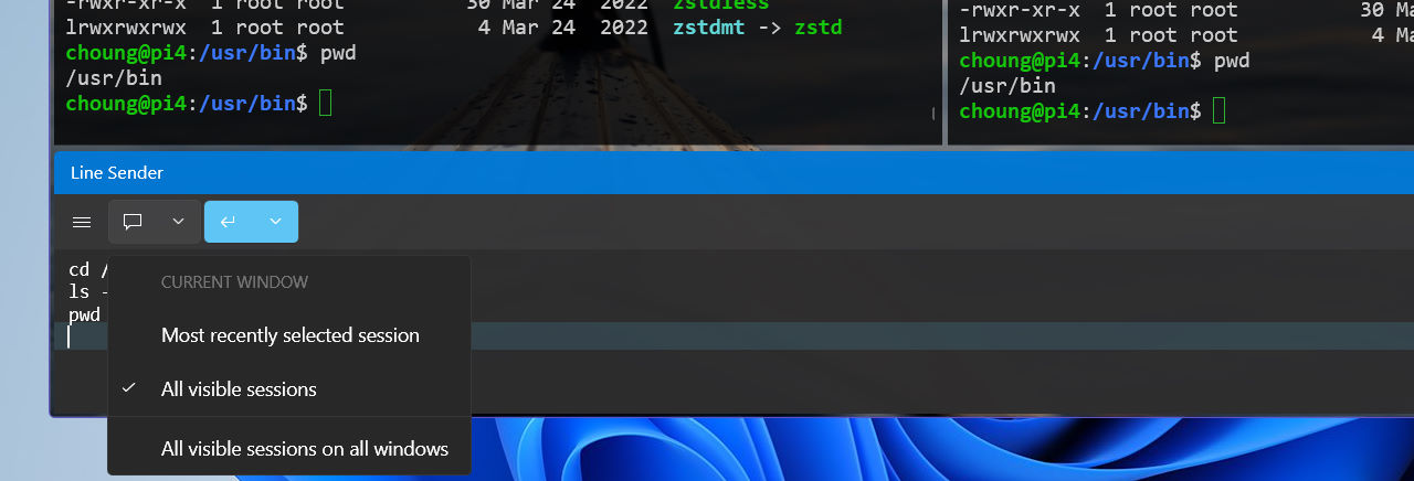 Line Sender can be handy when you have a slow connection or need to send the same set of commands repeatedly. Each text line you enter in Line Sender can also be automatically sent to multiple terminal sessions simultaneously.