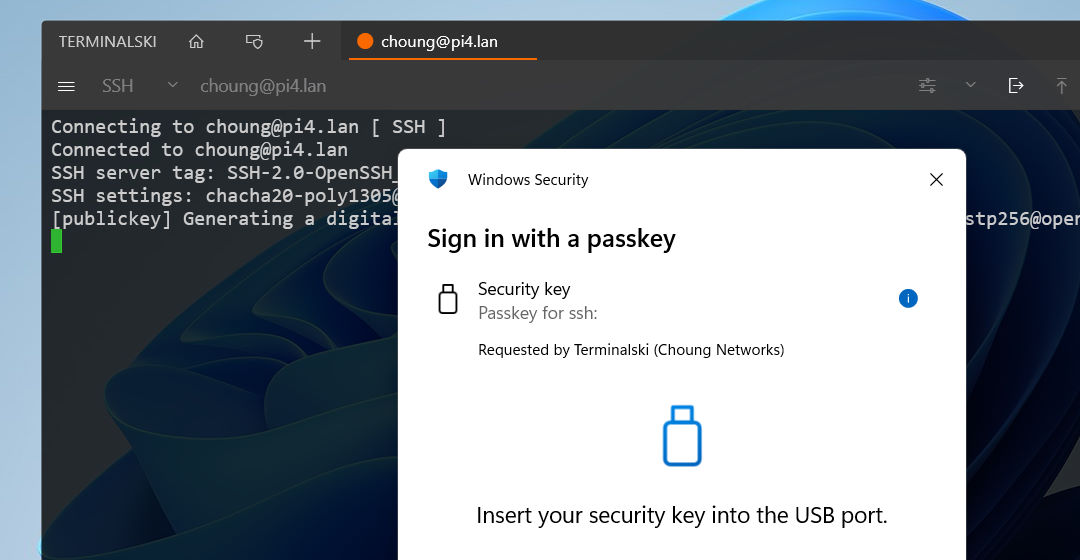Are you using a FIDO2 security key for logging into your website? You can also use that same security key for logging into your SSH server in Terminalski! You simply need to generate its paired private key in Terminalski and use it for SSH public key user authentication. When your SSH server requests a verification for that private key, just plug in your security key and tap it for your confirmation!