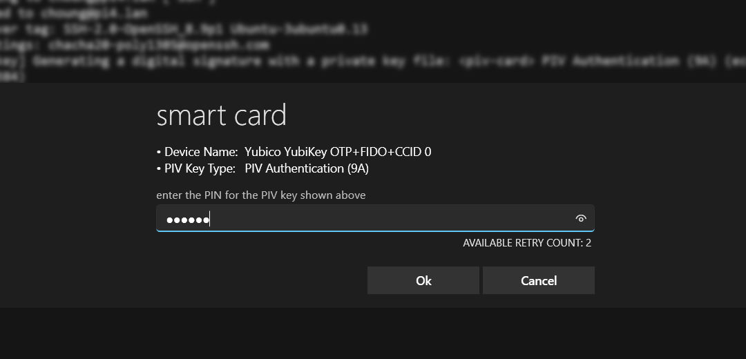 If you have a PIV smart card or a YubiKey, you can use it with Terminalski through Windows Hello just like any other Windows Hello compatible security devices such as fingerprint readers. But you can also use it directly without Windows Hello; you just need to plug it in and you are ready to use it for SSH public key user authentication in Terminalski. No need to pre-register it with Windows Hello or any third-party tools!